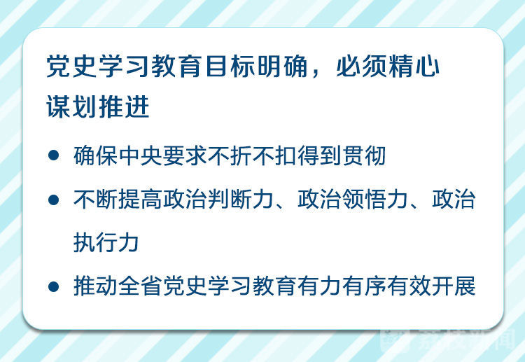 娄勤俭指出,党史学习教育目标明确,必须精心谋划推进,迅速在全省上下兴起党史学习教育热潮。要突出重点、务求实效,贯彻好党中央的工作部署,精准把握“学史明理、学史增信、学史崇德、学史力行”的目标要求,全面落实中央明确的学习内容,科学安排各项工作举措,确保中央要求不折不扣得到贯彻。利用好江苏丰富的党史资源,深入挖掘党在江苏大地的浴血奋战史、艰苦创业史、改革创新史,引导广大党员干部从周恩来精神、雨花英烈精神、新四军铁军精神、淮海战役精神中深刻感悟初心使命,不断提高政治判断力、政治领悟力、政治执行力。借鉴好历次党内集中教育的实践做法,推动全省党史学习教育有力有序有效开展。
