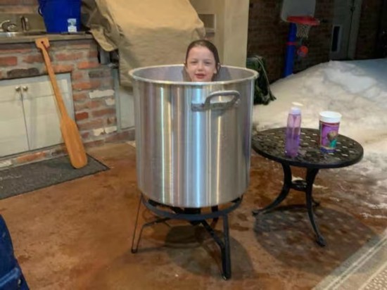 厨房里的超大龙虾锅似乎给她灵感,听说有朋友化了雪来给孩子洗澡,突然她意识到自己家也有一个非常完美的工具。