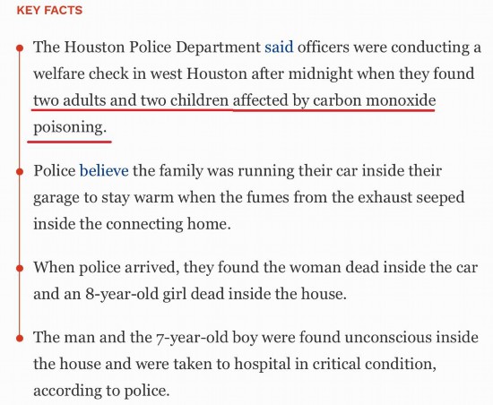 福布斯新闻网16日就曾报道,休斯敦市的一家六口因为使用木炭为房间供暖致使母亲和一个女儿死亡,父亲和一个儿子重度昏迷。