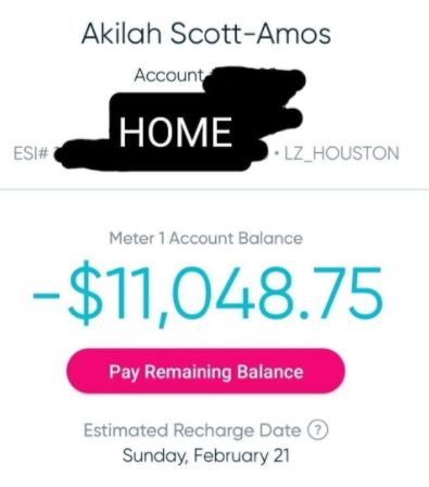 得州居民阿莫斯(Akilah Scott-Amos)描述了自己的窘境:家中水管破裂,水断了4天。这还不是最糟糕的,虽然仅经历短暂的停电,但却收到超1.1万美元的电费账单。在谈及这一账单时她表示,“我绝对负担不起。”