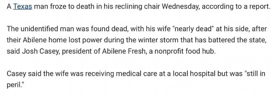 据福克斯新闻网报道,当地时间周三(17日),得州阿比林市一名男性被发现在家中的躺椅上冻死,当时他的妻子紧紧抱住他不放。