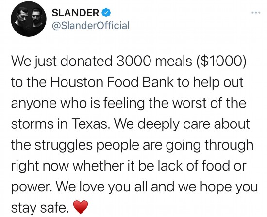 △网友:我们向休斯敦食品银行捐赠了3000顿饭(1000美元),以帮助那些在得克萨斯州受到风暴影响的人。爱你们!