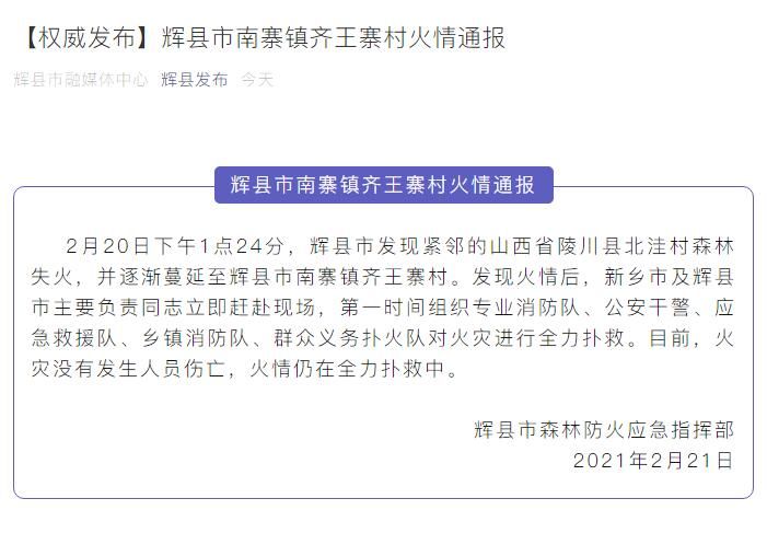 通报称,发现火情后,新乡市及辉县市组织专业消防队、公安干警、应急救援队、乡镇消防队、群众义务扑火队对火灾进行全力扑救。目前,火灾没有发生人员伤亡,火情仍在全力扑救中。