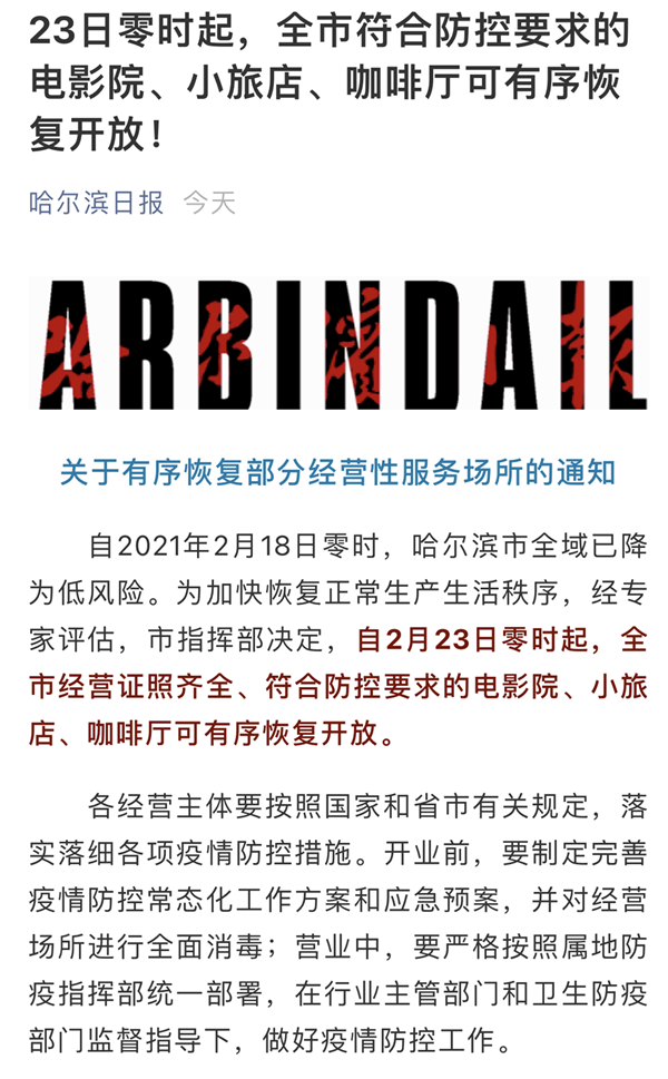 荔枝新闻讯 微信公众号“哈尔滨日报”2月21日消息,自2021年2月18日零时,哈尔滨市全域已降为低风险。为加快恢复正常生产生活秩序,经专家评估,市指挥部决定,自2月23日零时起,全市经营证照齐全、符合防控要求的电影院、小旅店、咖啡厅可有序恢复开放。