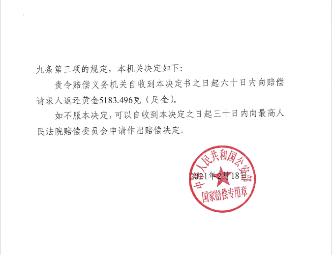 2月22日,澎湃新闻从甘肃籍商人马光辉的代理人处获悉,2月18日,公安部作出公赔复决字﹝2021﹞1号刑事赔偿复议决定书(以下简称:《复议决定书》),责令赔偿义务机关,即青海省公安厅在收到《复议决定书》之日起60日内向马光辉返还黄金5183.496克(足金)。