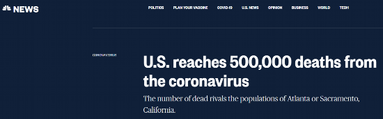 NBC新闻的统计显示,截至美国东部时间22日凌晨,美国约有 500700人死于新冠,这一数字与亚特兰大和加州萨克拉门托的人口数量相当。