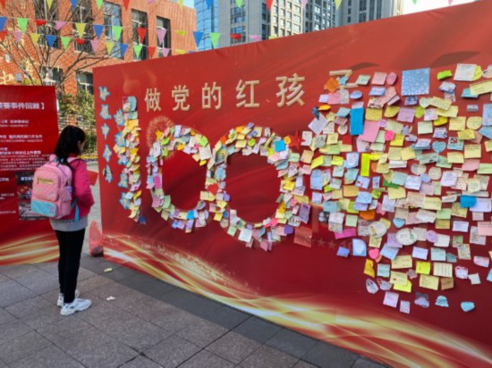 常州市新北区三井实验小学用红色的建党100周年主题墙迎接学生报到,学校开学第一课的内容是“讲一讲党的诞生历程,说一说党的发展故事”,立下新年的学习志向。