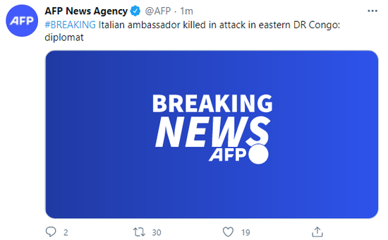 据法新社22日消息,意大利大使在刚果东部一场袭击中身亡。