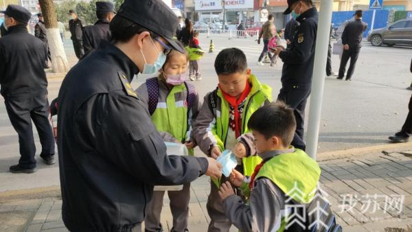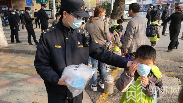 在护学的同时,城管队员发现校园周边的一些商户为了招揽顾客,将摊位摆在店外,吸引了不少学生和家长驻足。这不仅影响了正常交通,也存在安全隐患。雨花城管对校园周边商户逐家上门宣传,对于违反“门前三包”规定占道经营的摊点坚决取缔。此外,城管队员随身携带备用口罩,提供给口罩遗失的学生和家长,并向其宣传疫情防控知识。