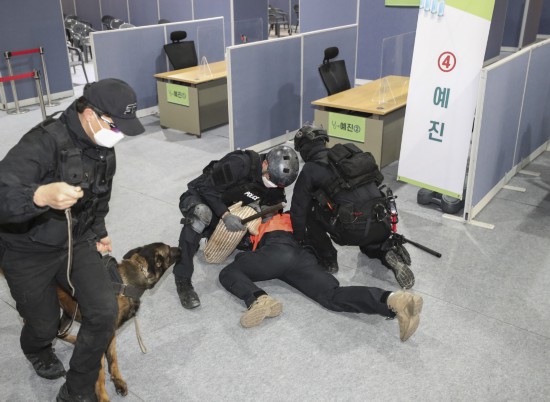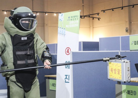 韩国釜山疫苗接种中心,开展反恐演练