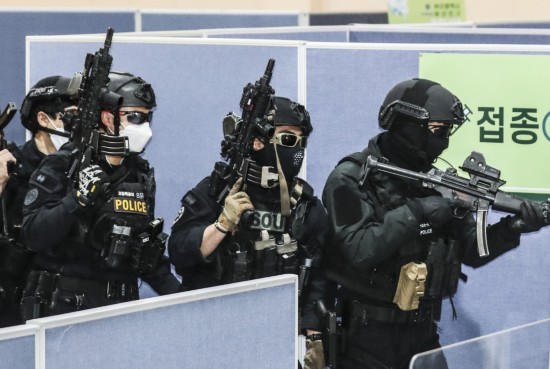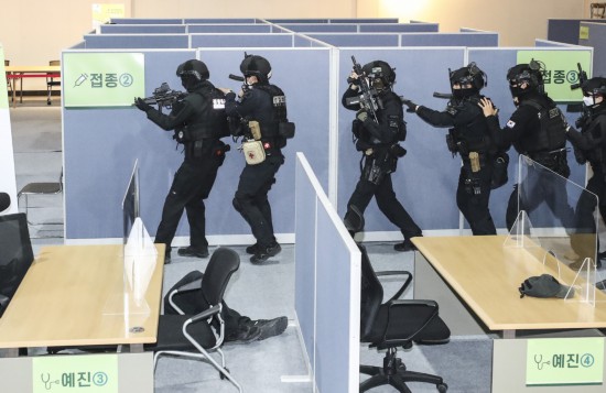 韩国釜山疫苗接种中心,开展反恐演练(韩联社)
