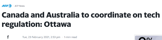 据法新社报道,加拿大总理办公室当地时间23日表示,加总理特鲁多与澳大利亚总理莫里森于22日举行会谈后计划,双方努力协调使科技公司巨头为(发布)媒体报道内容付费。