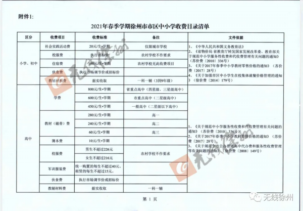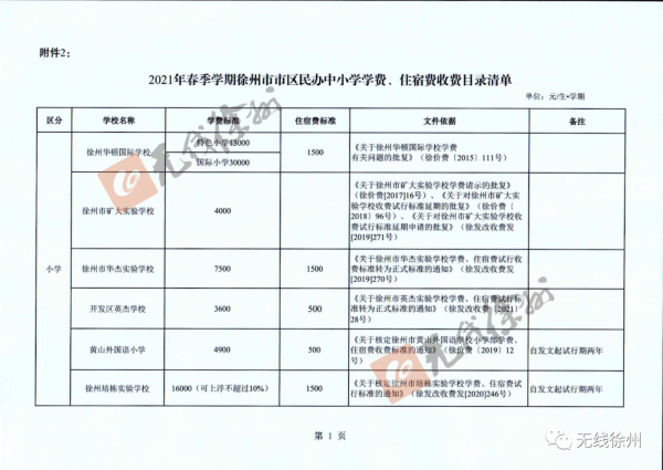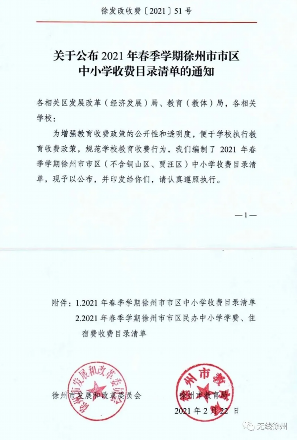 2月23日,徐州市发展和改革委员会、徐州市教育局联合公布2021年春季学期徐州市市区中小学收费目录清单。