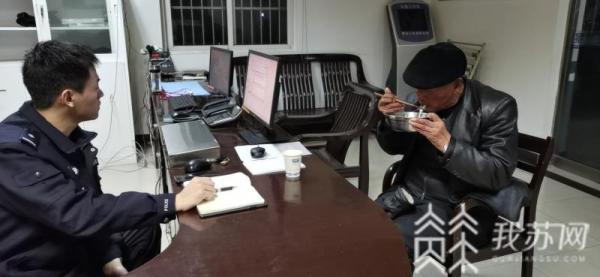 长航仪征派出所值班民警到现场后将老人带回所。考虑晚上风大又降温了,民警打开值班室空调给老人取暖,安抚老人,按照老人报的名字,仪征所值班民警与仪征市公安局月塘派出所联系,反复核查,最终确定老人在惠民花园的实际住址和其儿子的联系电话。值班民警孙文见老人又饿又冷,赶紧给老人煮上一碗热腾腾的鸡蛋面,端给老人。待老人周某吃饱喝足,民警开车送老人回居住的小区,交给其家人。
