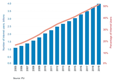 国际电联估计,到2019年底,全球使用互联网的人口比例略高于51%,即40亿人。图片来源:联合国国际电信联盟
