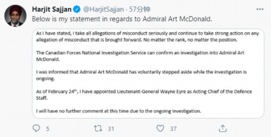 加拿大国防部长哈吉特·萨詹(Harjit Sajjan)当地时间2月24日深夜发表的简短声明说,国防参谋长阿特·麦克唐纳(Art McDonald)因正在接受加拿大军队国家调查服务局的调查而主动辞职。不过,萨詹的声明没有指明麦克唐纳因何原因遭到调查。