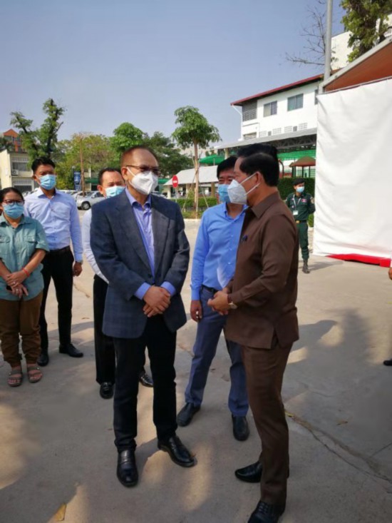 中国驻柬埔寨大使馆2月25日消息,2月24日下午和25日上午,驻柬埔寨使馆参赞兼总领事李杰代表使馆先后赴金边市长夏社医疗中心和柬苏友谊医院,实地看望慰问被隔离和确诊新冠肺炎的中国公民。金边市长坤盛、柬外交部领事司副司长尤索凯林及使馆领侨处主任胡伟等参加。