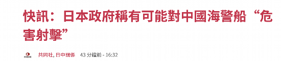 【环球网快讯 记者 边子豪 邢晓婧】据日本共同社刚刚消息,日本政府25日在自民党国防小组与安全保障调查会联席会议上声称,如果中国海警船试图登陆“尖阁诸岛”(即我钓鱼岛及其附属岛屿),日方可能会将此认定为“凶恶犯罪”,可以向对方进行“危害射击”。报道称,自民党相关人士在会后透露了这一消息。