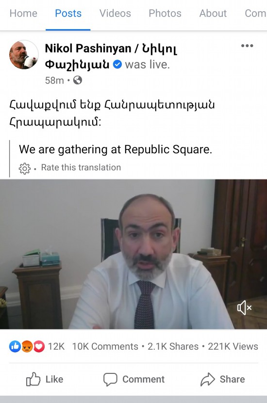 他在直播中呼吁民众上街支持自己,另一方面禁止军队参与游行,并指出军队参与游行是违法行为。帕希尼扬表示目前情况可控,并宣布将于当地时间16:00(北京时间20:00)到共和国广场上讲话,到时由警察和执法人员维持秩序。