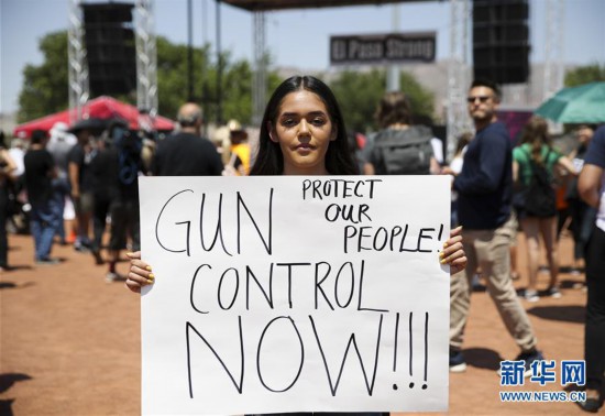 2019年8月7日,在美国得克萨斯州埃尔帕索市的一个公园里,一名女子参加抗议种族主义、呼吁控枪的集会。新华社记者 王迎 摄