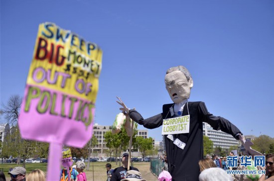 2016年4月17日,在美国首都华盛顿国会山,参加反对“金钱政治”的示威者举着写有“金钱滚出政治”的标语牌和“大公司的说客”的假人。新华社记者 殷博古 摄