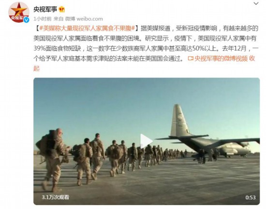 据美媒报道,受新冠疫情影响,有越来越多的美国现役军人家属面临着食不果腹的困境。研究显示,疫情下,美国现役军人家属中有39%面临食物短缺,这一数字在少数族裔军人家属中甚至高达50%以上。去年12月,一个给予军人家庭基本需求津贴的法案未能在美国国会通过。