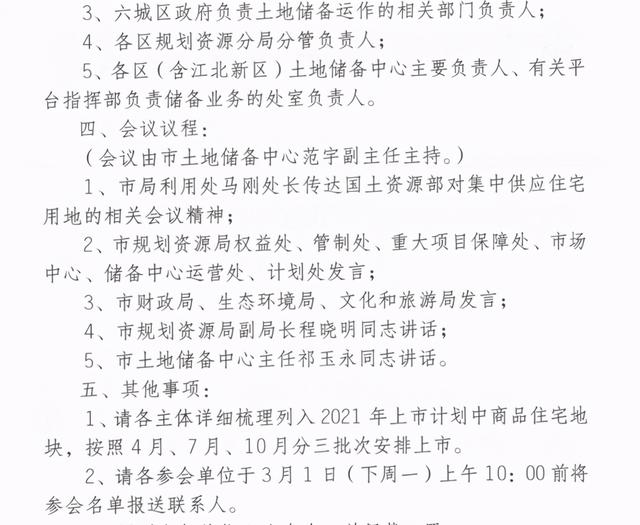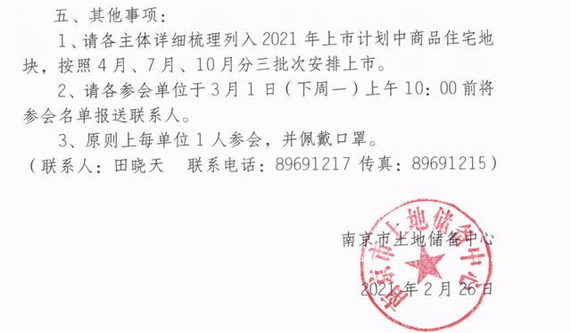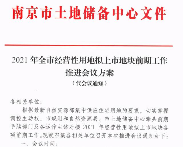 南京市土地储备中心2月26日发布的一则通知显示,将于3月1日召开2021年全市经营性用地拟上市地块前期工作推进会议。会议将根据最新自然资源部对集中供应住宅用地的要求,将今年住宅用地上市的时间安排在4月、7月和10月。