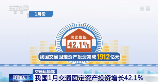 交通运输部数据显示,1月份,我国交通固定资产投资完成1912亿元,同比增长42.1%。其中,公路水路完成投资1434亿元,同比增长52.3%。
