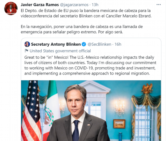 甚至有人猜测这“不寻常”。墨西哥记者哈维尔·加尔萨·拉莫斯(Javier Garza Ramos)写道,“在国务卿布林肯与外长马塞洛·埃布拉德的视频会议上,美国国务院把墨西哥国旗倒挂了。航海中,升起一面倒挂的旗子是发出极端危险的紧急信号。这一定是有原因的。” ↓