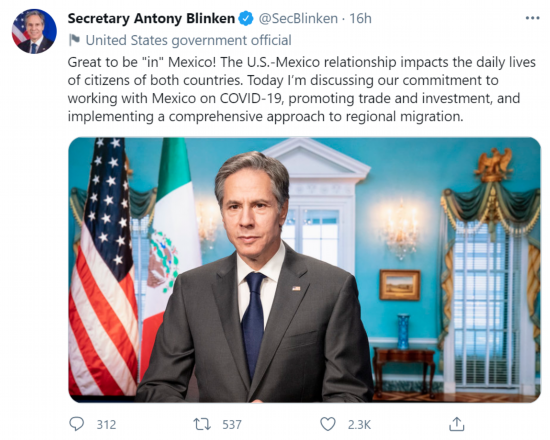 布林肯当天发推称:“很高心‘来到’墨西哥!美墨关系影响着两国民众的日常生活。今天,我将就我们与墨西哥共同应对新冠疫情的合作、促进贸易投资以及对地区性移民实施全面措施的承诺进行讨论。”推特还附带一张照片,照片上的布林肯坐在桌前,背后是美国国旗和墨西哥国旗。↓