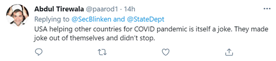 而对于布林肯推文中提到两国合作抗击疫情,更是有网友不屑道:“美国帮助其他国家抗击疫情就是个笑话。他们开玩笑不带停的。” ↓