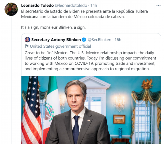 还有墨西哥人很快指出这一错误并表达不满。记者莱昂纳多 托莱多(Leonardo Toledo)写道:“拜登的国务卿将墨西哥国旗倒挂在墨西哥合众国前。这是个标志,布林肯先生,是个标志啊。”↓