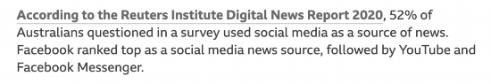 路透社研究所的一个调查显示,现在52%的澳大利亚人将社交媒体作为新闻来源。脸书作为社交媒体新闻来源排名第一,其次是YouTube和Facebook Messenger。流量和收入息息相关,现在在澳大利亚网络上每投入100美元的广告,谷歌获得53美元,脸书拿走28美元。