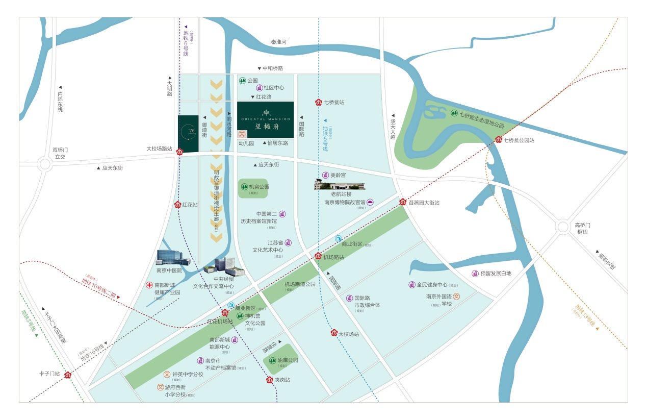 中山东路、中山南路、龙蟠中路、大明路、应天大街五线城市干线;地铁6号线(在建)、5号线(在建)、与10号线/13号线/16号线串联,速通全城。