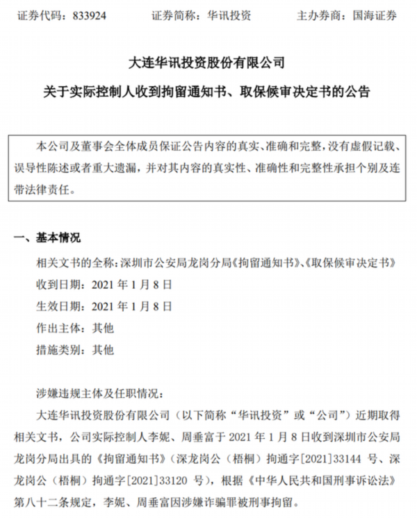 随后,大连华讯2021年2月4日晚间发布公告称,公司实际控制人李妮、周垂富于2021年1月8日收到深圳市公安局龙岗分局出具的《拘留通知书》,李妮、周垂富因涉嫌诈骗罪被刑事拘留。