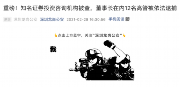 最近,深圳警方就公布了一起大案。据深圳龙岗公安微信公号28日消息,一家老牌知名持照证券咨询机构,冠冕堂皇的新三板上市公司,因为涉嫌诈骗、虚假广告罪,包括董事长在内12名高管以及其他嫌疑人共计147人被依法逮捕。