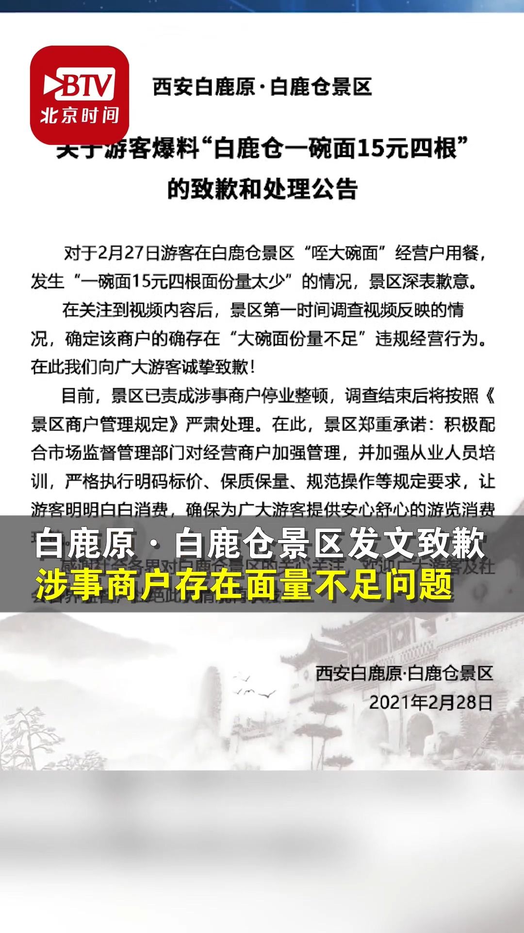 近日,有网友爆料去陕西西安白鹿原景区吃饭一碗面条卖15元,却只有4根面。视频显示,游客点的面条碗很大,里面的面条却寥寥无几。白鹿原·白鹿仓景区发文致歉称,涉事商户存在面量不足问题,景区已责成涉事商户停业整顿,调查结束后将严肃处理。