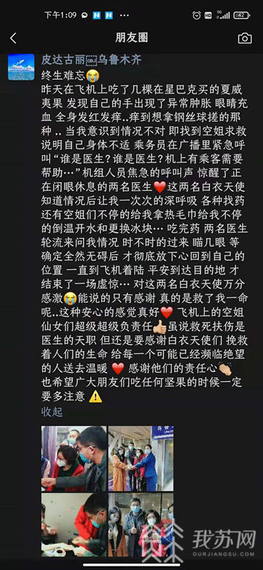 当晚11点50分飞机落地,恢复健康的患者和机组工作人员向齐亮及参与医治的南京中大医院张医生表示感谢。“能说的只有感谢,真的救了我一命,这种安心的感觉真好。”事后,患者在朋友圈发文向医生和机组人员表示感谢。