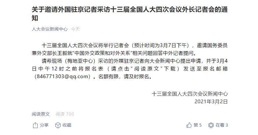 十三届全国人大四次会议将举行记者会(预计时间为3月7日下午),邀请国务委员兼外交部长王毅就“中国外交政策和对外关系”相关问题回答中外记者提问。