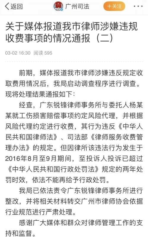 3月2日,广州司法局发布针对此事的处理结果:经查,广东锐锋律师事务所与委托人杨某某就工伤损害赔偿事项约定风险代理,并根据风险代理约定进行收费,其行为违反《中华人民共和国律师法》、司法部《律师服务收费管理办法》的规定。