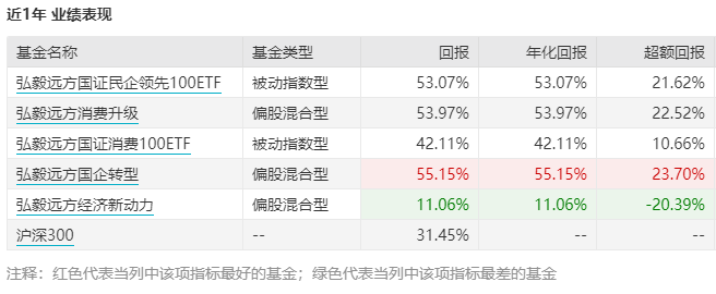 从主动管理产品业绩来看,4只表现高于同期沪深300指数表现,1只跑输沪深300指数。其中,弘毅远方国企转型、弘毅远方消费升级、弘毅远方国证民企领先100ETF近1年的回报均超过50%,同期沪深300表现为涨31.45%;此外,弘毅远方国证消费100ETF的近一年表现为涨42.11%;只有弘毅远方经济新动力近一年表现为11.06%。