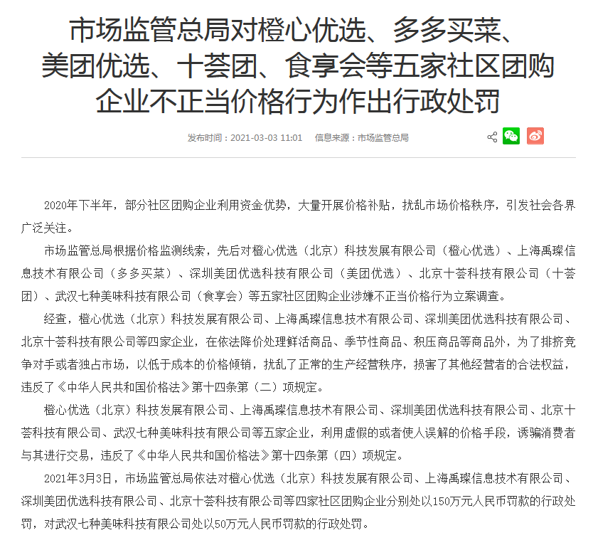荔枝新闻讯 3月3日,市场监管总局依法对橙心优选(北京)科技发展有限公司、上海禹璨信息技术有限公司、深圳美团优选科技有限公司、北京十荟科技有限公司等四家社区团购企业分别处以150万元人民币罚款的行政处罚,对武汉七种美味科技有限公司处以50万元人民币罚款的行政处罚。