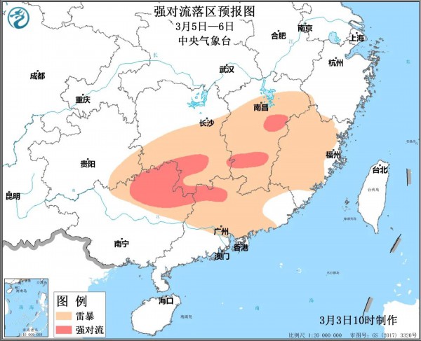 进入3月,南方地区冷暖气流交替频繁,降雨和强对流天气会逐渐增多增强。预计5日下午到6日,江西中部、湖南南部、广西北部及广东北部将出现短时强降雨,局地伴有8~9级雷暴大风天气,1小时最大降雨量20~50毫米。