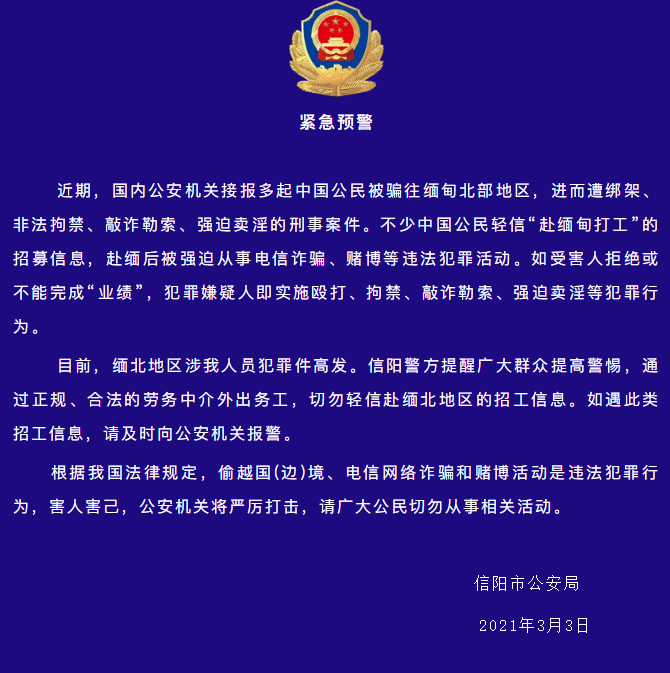 荔枝新闻讯 3月3日,信阳市公安局在其微信公众号上发布《紧急预警》称,近期,国内公安机关接报多起中国公民被骗往缅甸北部地区,进而遭绑架、非法拘禁、敲诈勒索、强迫卖淫的刑事案件。不少中国公民轻信“赴缅甸打工”的招募信息,赴缅后被强迫从事电信诈骗、赌博等违法犯罪活动。如受害人拒绝或不能完成“业绩”,犯罪嫌疑人即实施殴打、拘禁、敲诈勒索、强迫卖淫等犯罪行为。