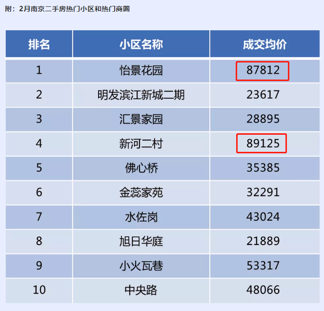 在价格方面,根据我爱我家南京研究院的统计,由于学区房市场相当活跃,今年2月南京二手房成交价持续上扬,达到37349元/㎡,环比再涨0.6%。在2月全市交易热门小区的排名中,学区房怡景花园位居全市之首,当月成交均价高达87812元/㎡,排名第四的新河二村成交价则达到89125元/㎡,受到买家的追捧。