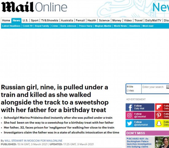 报道称,遇难的女孩名叫玛丽娜(Marina Prideina)。这起事件发生在克拉斯诺亚尔斯克地区的一处车站内。当天,玛丽娜的父亲带她去糖果店买生日礼物。为了更快的到那里,他们选了一条“近路”。