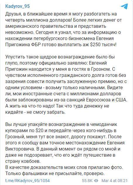 车臣领导人卡德罗夫在社交媒体上写道,“朋友们,我很快就会变得富有,将得到25万美元!很难想象从美国政府获得钱是这样容易。今天,我得知美国联邦调查局准备支付25万美元,来获得有关圣彼得堡商人叶夫根尼·普里戈津下落的信息!”