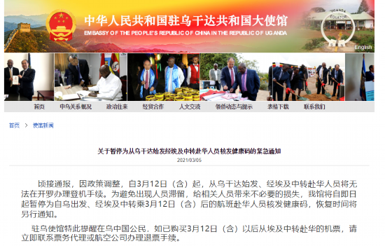 为避免出现人员滞留,给相关人员带来不必要的损失,中国驻乌干达使馆将自即日起暂停为自乌出发、经埃及中转乘3月12日(含)后的航班赴华人员核发健康码,恢复时间将另行通知。