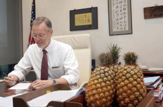 3月2日,美在台协会(AIT)在社交媒体上发文:“你今天凤梨了吗?AIT今天、明天,往后的许多天都要凤梨!”帖子附带的照片显示,美在台协会台北办事处处长郦英杰的办公桌上摆放了三个凤梨。帖文中还带上了“真朋友真进展”以及“团结爱凤梨”的标签。