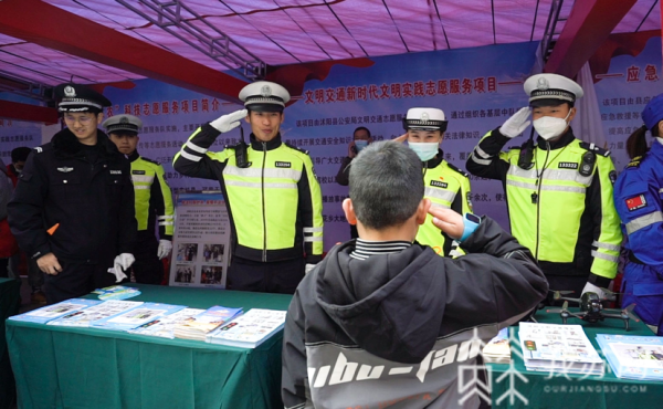 沭阳交警文明交通志愿服务站一“开张”,就有一位小朋友来询问安全出行知识,民警仔细讲解后给民警们敬礼。